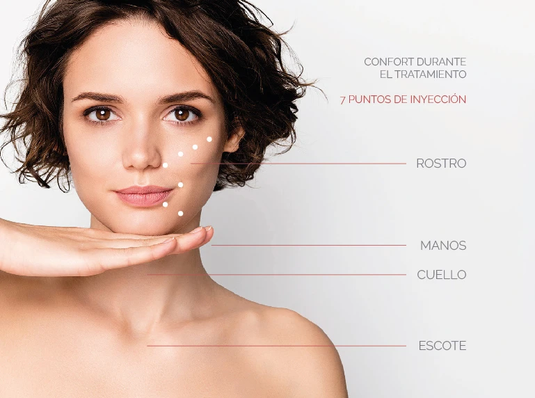 Se realizan 7 puntos de aplicación en cada lado de la cara, llamados puntos bioestéticos. Estos puntos de aplicación pueden variar según las necesidades de cada paciente.